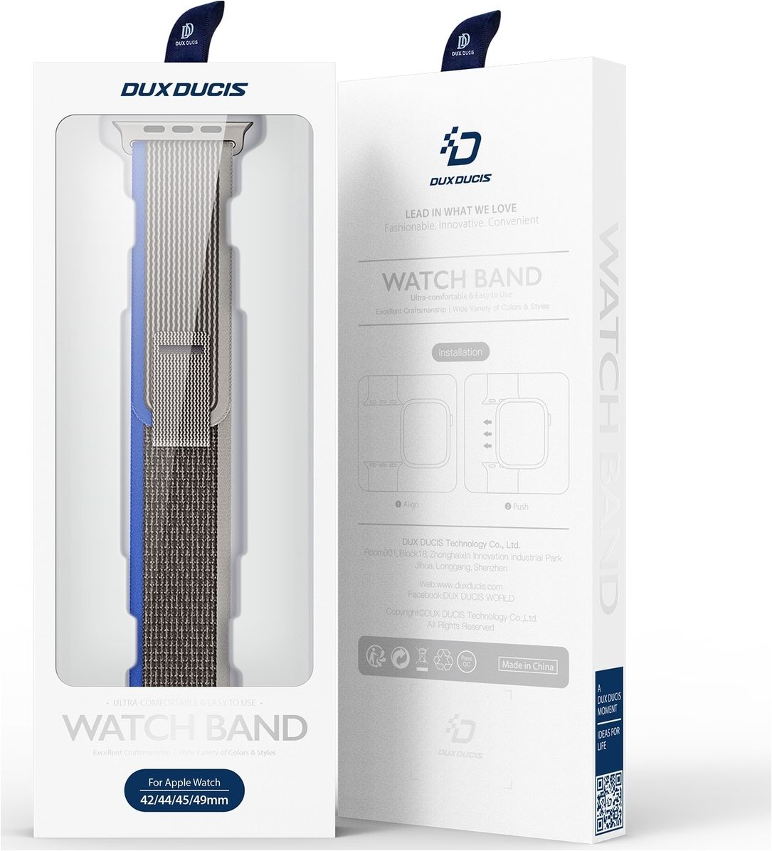 Het Dux Ducis YJ Apple Watch bandje in de kleur blauw / grijs is gemaakt van hoogwaardig geweven nylon. Dankzij het sterke maar toch zachte materiaal biedt dit Apple Watch bandje uitstekend comfort. Nylon is lichtgewicht en ademend, wat zorgt voor draagcomfort gedurende de hele dag, zelfs tijdens intensieve fysieke activiteiten. De flexibiliteit en zachtheid van het materiaal maken het vriendelijk voor de huid.