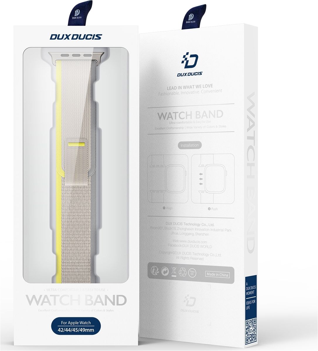Het Dux Ducis YJ Apple Watch bandje in de kleur grijs / geel is gemaakt van hoogwaardig geweven nylon. Dankzij het sterke maar toch zachte materiaal biedt dit Apple Watch bandje uitstekend comfort. Nylon is lichtgewicht en ademend, wat zorgt voor draagcomfort gedurende de hele dag, zelfs tijdens intensieve fysieke activiteiten. De flexibiliteit en zachtheid van het materiaal maken het vriendelijk voor de huid.