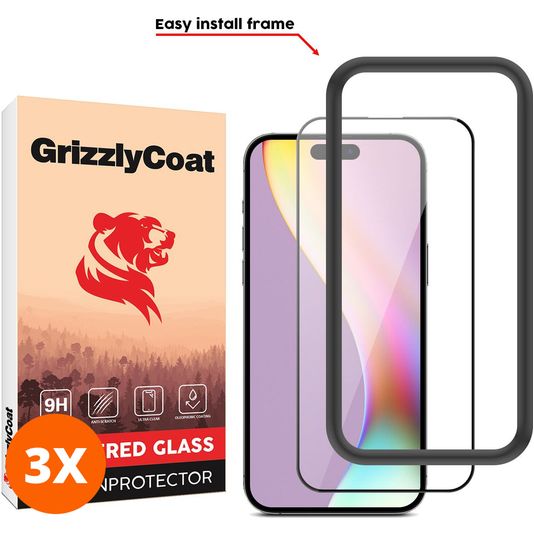 GrizzlyCoat Easy Fit iPhone 15 Plus Glazen Screenprotector - Case Friendly + Installatie Frame - Zwart (3-Pack)
