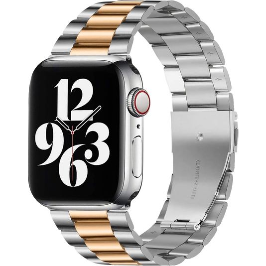 Kies deze Mobigear Antwerp Apple Watch band in de kleur roségoud / zilver voor een tijdloze en elegante look die moeiteloos bij elke outfit past. Een stalen Apple Watch band is geschikt voor elke gelegenheid, van informeel tot zakelijk. Het gewicht van staal geeft een gevoel van soliditeit en balans aan de pols, wat veel dragers als prettig ervaren. Daarnaast is de roestvrij stalen Apple Watch band bestand tegen corrosie en vlekken, wat het ideaal maakt voor allerlei activiteiten en weersomstandigheden. De Mobigear Antwerp band is gemakkelijk schoon te maken en vergt minimaal onderhoud.