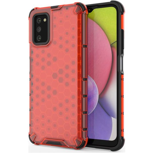 Bescherm je Samsung Galaxy A03s tegen beschadigingen met de Mobigear Honeycomb backcover gemaakt van stevig kunststof. Het hoesje is uitgevoerd in de kleur rood en bedekt de achter- en zijkant van je telefoon. De voorkant blijft met deze backcover vrij, zodat je scherm altijd direct toegankelijk is. Bij deze backcover is je scherm niet bedekt. Bestel een Samsung Galaxy A03s screenprotector mee voor volledige bescherming.