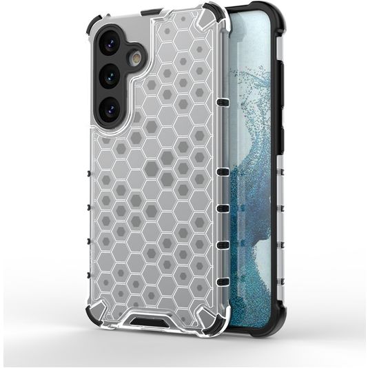Geef je Samsung Galaxy S24 robuuste bescherming met het Mobigear Honeycomb backcover hoesje. Dit kunststof hoesje is een stevig schild tegen krassen, deuken en andere beschadigingen bij dagelijks gebruik.