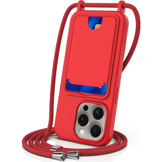 Mobigear Lanyard Card iPhone 16 Pro Max Siliconen Hoesje met koord en Pasjeshouder - Rood