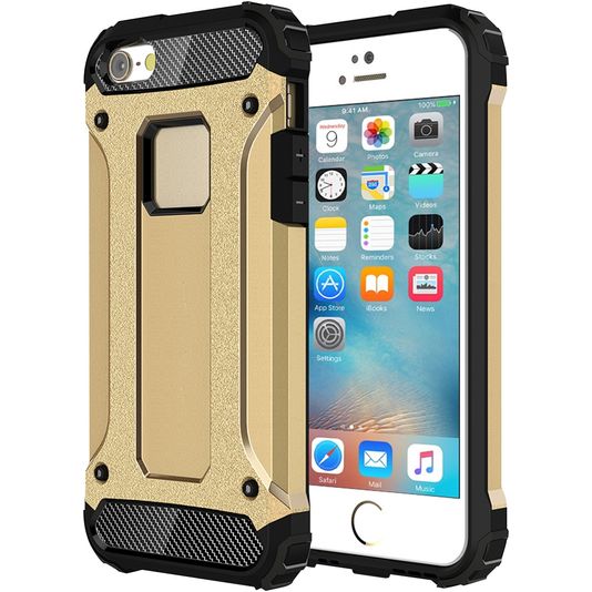 Bescherm je Apple iPhone SE (2016) tegen beschadigingen met de Mobigear Outdoor backcover gemaakt van stevig kunststof. Het hoesje is uitgevoerd in de kleur goud en bedekt de achter- en zijkant van je telefoon. De voorkant blijft met deze backcover vrij, zodat je scherm altijd direct toegankelijk is.