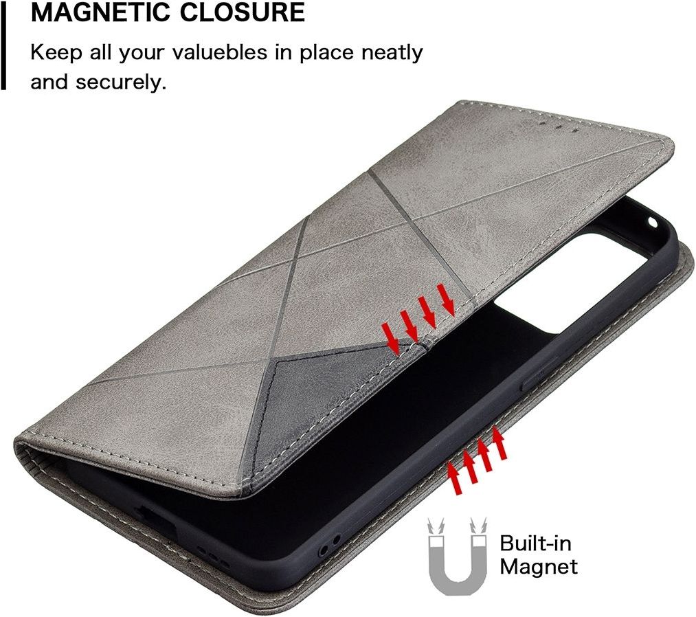 Wil je een OPPO Reno 6 5G hoesje met volledige bescherming rondom en een stijlvol en praktisch design? Dan is dit Mobigear Rhombus Slim bookcase hoesje voor OPPO Reno 6 5G de perfecte keuze. Het booktype hoesje is gemaakt van hoogwaardig kunstleer en uitgevoerd in de kleur grijs. Met een boek hoesje is je OPPO Reno 6 5G rondom goed beschermd, inclusief het kwetsbare scherm. De voorklep opent opzij als een boek en sluit stevig met een magnetische sluiting. Er is ruimte voor 2 pasjes zodat je altijd je bankpas of ID bij de hand hebt.
