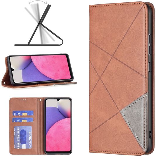 Wil je een Samsung Galaxy A33 hoesje met volledige bescherming rondom en een stijlvol en praktisch design? Dan is dit Mobigear Rhombus Slim bookcase hoesje voor Samsung Galaxy A33 de perfecte keuze. Het booktype hoesje is gemaakt van hoogwaardig kunstleer en uitgevoerd in de kleur bruin. Met een boek hoesje is je Samsung Galaxy A33 rondom goed beschermd, inclusief het kwetsbare scherm. De voorklep opent opzij als een boek en sluit stevig met een magnetische sluiting. Er is ruimte voor 2 pasjes zodat je altijd je bankpas of ID bij de hand hebt.