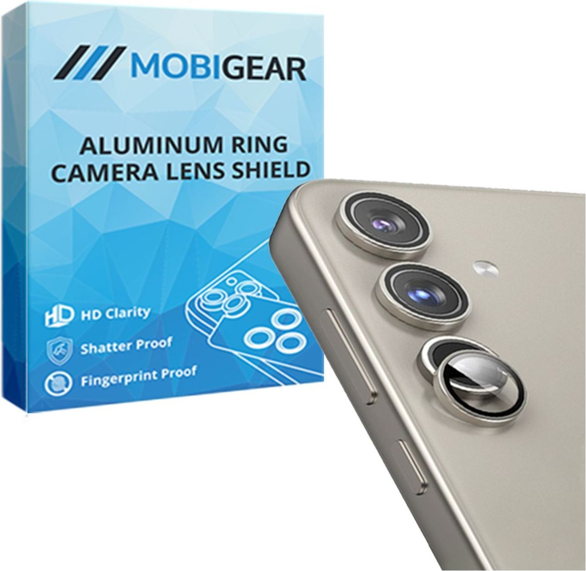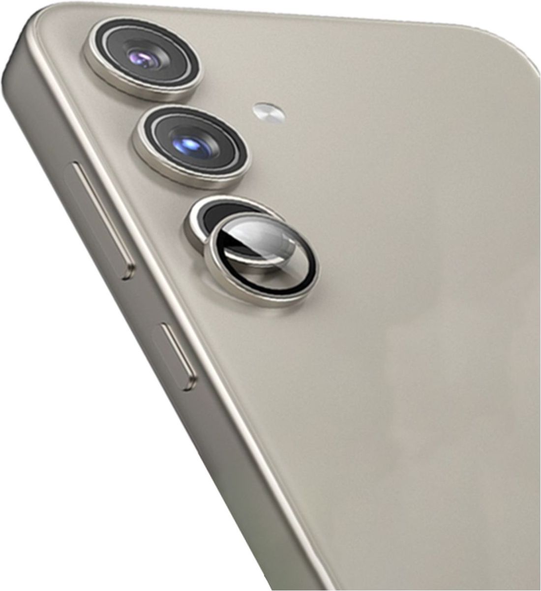 De Mobigear camera lens protector is voorzien van een stijlvolle omlijsting in de kleur grijs. Deze omlijsting loopt schuin af voor een naadloze aansluiting op je Samsung Galaxy S24. Bovendien bedekt deze camera lens protector door het frame je volledige toestel van rand tot rand.