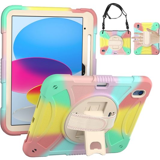 Mobigear SureGrip iPad 10 (2022) Hoes Hard Kunststof,Siliconen Backcover + Stylus Houder + Schouderband + Standaard - Rainbow