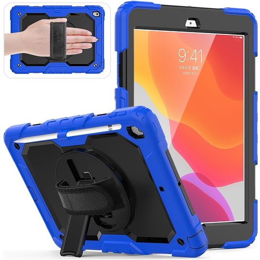 Mobigear SureGrip Xtreme iPad 7 (2019) Hoes Hard Kunststof,Siliconen Backcover + Stylus Houder + Schouderband + Standaard - Zwart / Blauw