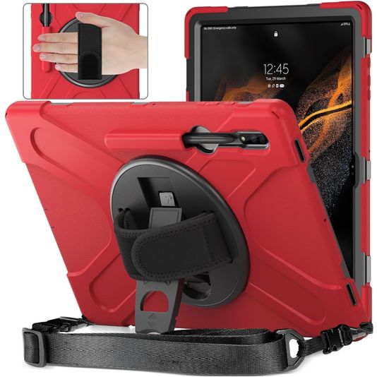 Mobigear SureGrip XGuard Samsung Galaxy Tab S8 Ultra Hoes Hard Kunststof,Siliconen Backcover + Stylus Houder + Schouderband + Standaard - Rood