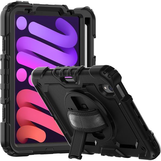 Mobigear SureGrip Xtreme iPad Mini 7 (2024) Hoes Hard Kunststof,Siliconen Backcover + Stylus Houder + Schouderband + Standaard - Zwart