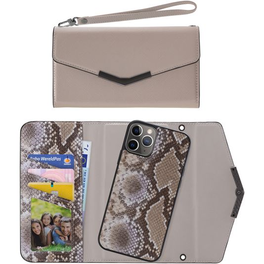 Combineer de stijl en bescherming van een Apple iPhone 11 Pro clutch en de handzaamheid van een backcover met de Apple iPhone 11 Pro Elegant Magnet 2in1 clutch van Mobilize in de uitvoering beige snake. Het backcover hoesje zit met een magneet vast in de clutch en kan desgewenst ook apart gebruikt worden.