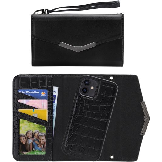 Combineer de stijl en bescherming van een Apple iPhone 12 Pro clutch en de handzaamheid van een backcover met de Apple iPhone 12 Pro Elegant Magnet 2in1 clutch van Mobilize in de uitvoering black croco. Het backcover hoesje zit met een magneet vast in de clutch en kan desgewenst ook apart gebruikt worden.