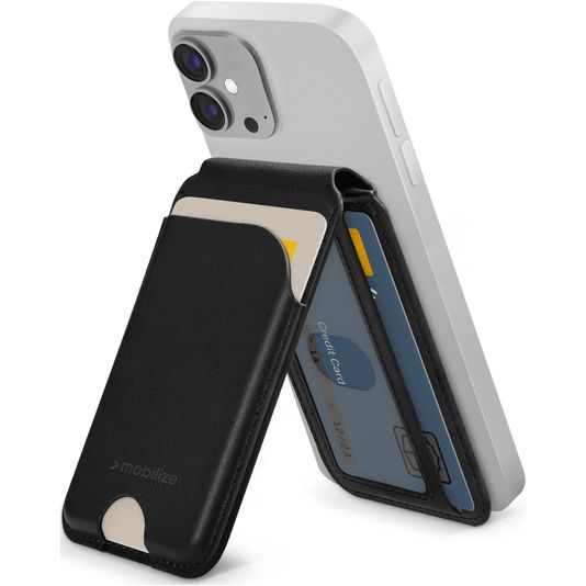 De Mobilize Magnet Card MagSafe-compatible kaarthouder is verkrijgbaar in de kleur zwart en is gemaakt van luxe hoogwaardig kunstleer.