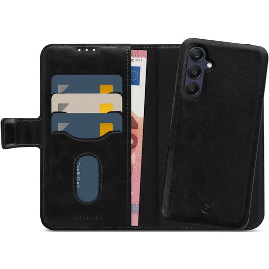 Combineer de voordelen van een Samsung Galaxy A25 bookcase hoesje met een compacte losse backcover. De Samsung Galaxy A25 Magnet Gelly Wallet 2in1 bookcase van Mobilize in de uitvoering zwart is een unieke 2 in 1 oplossing. Het losse backcover hoesje aan de binnenkant zit met een magneet vast in het boekje en kan desgewenst ook los gebruikt worden.