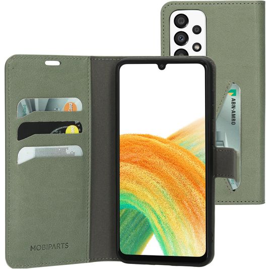 Wil je een Samsung Galaxy A33 hoesje met volledige bescherming rondom en een stijlvol en praktisch design? Dan is dit Mobiparts Classic Wallet bookcase hoesje voor Samsung Galaxy A33 de perfecte keuze. Het booktype hoesje is gemaakt van hoogwaardig kunstleer en uitgevoerd in de kleur stone green. Met een boek hoesje is je Samsung Galaxy A33 rondom goed beschermd, inclusief het kwetsbare scherm. De voorklep opent opzij als een boek en sluit stevig met een magnetische sluiting. Er is ruimte voor 4 pasjes zodat je altijd je bankpas of ID bij de hand hebt.