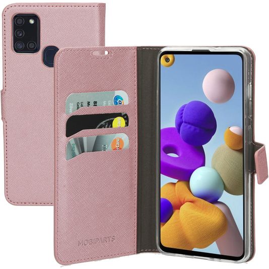 Wil je een Samsung Galaxy A21s hoesje met volledige bescherming rondom en een stijlvol en praktisch design? Dan is dit Mobiparts Saffiano Wallet bookcase hoesje voor Samsung Galaxy A21s de perfecte keuze. Het booktype hoesje is gemaakt van hoogwaardig kunstleer en uitgevoerd in de kleur roze. Met een boek hoesje is je Samsung Galaxy A21s rondom goed beschermd, inclusief het kwetsbare scherm. De voorklep opent opzij als een boek en sluit stevig met een magnetische sluiting. Er is ruimte voor 3 pasjes zodat je altijd je bankpas of ID bij de hand hebt.