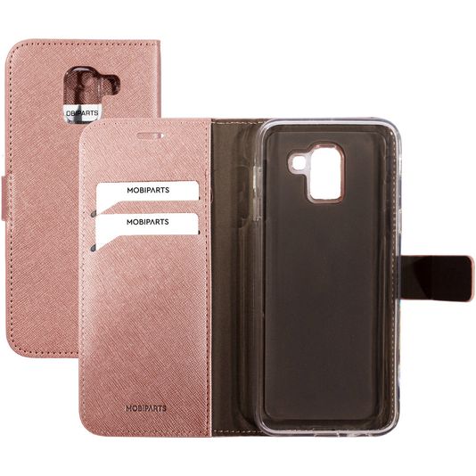 Wil je een Samsung Galaxy J6 (2018) hoesje met volledige bescherming rondom en een stijlvol en praktisch design? Dan is dit Mobiparts Saffiano Wallet bookcase hoesje voor Samsung Galaxy J6 (2018) de perfecte keuze. Het booktype hoesje is gemaakt van hoogwaardig kunstleer en uitgevoerd in de kleur roze. Met een boek hoesje is je Samsung Galaxy J6 (2018) rondom goed beschermd, inclusief het kwetsbare scherm. De voorklep opent opzij als een boek en sluit stevig met een magnetische sluiting. Er is ruimte voor 2 pasjes zodat je altijd je bankpas of ID bij de hand hebt.