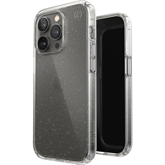 Geef je Apple iPhone 14 Pro robuuste bescherming met het Speck Presidio Perfect Clear Glitter backcover hoesje. Dit kunststof hoesje is een stevig schild tegen krassen, deuken en andere beschadigingen bij dagelijks gebruik.